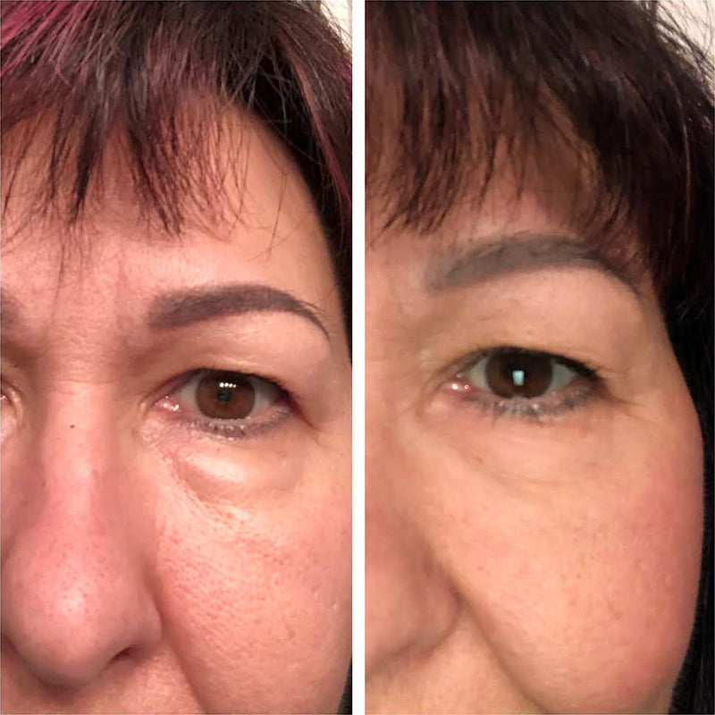 The bags under the eyes are definitely less and the pores are noticeably smaller. The lines and wrinkles have decreased.